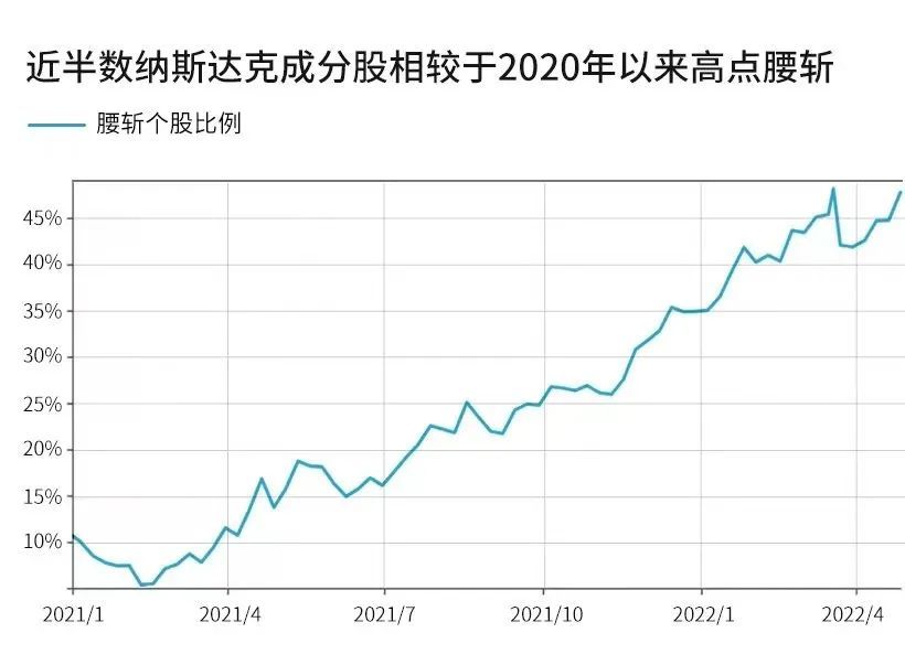 截止本周,纳斯达克指数过半的成分股相较于20年以来的的高点腰斩,即下跌超50%,纳指也是美股三大股指中率先进入技术性熊市的。
