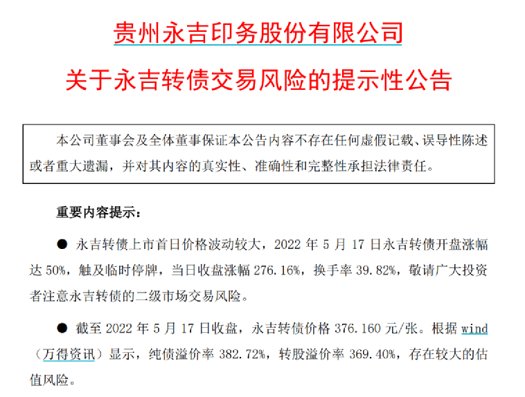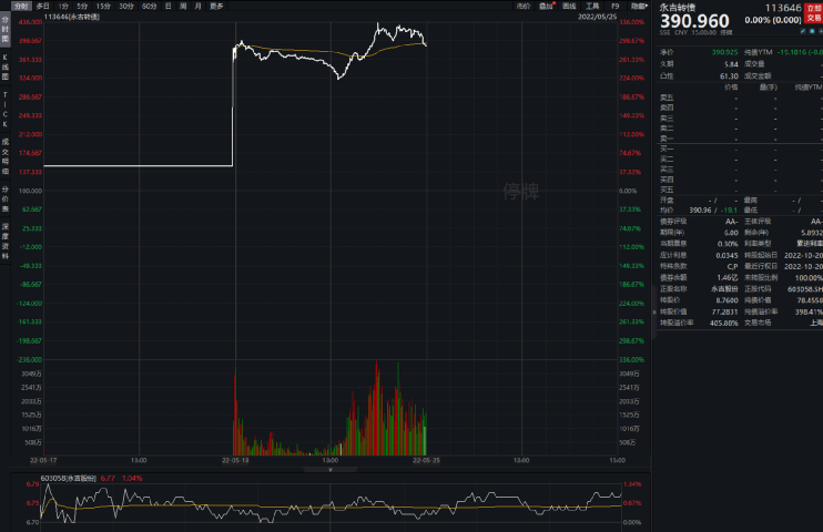 回顾永吉转债的市场表现,5月17日,永吉转债以150元顶格开盘,触及临时停牌机制;临近收盘前最后3分钟复牌再度暴涨,当期收盘价格达到376.16元/张,涨幅276.16%,换手率达到39.82%。