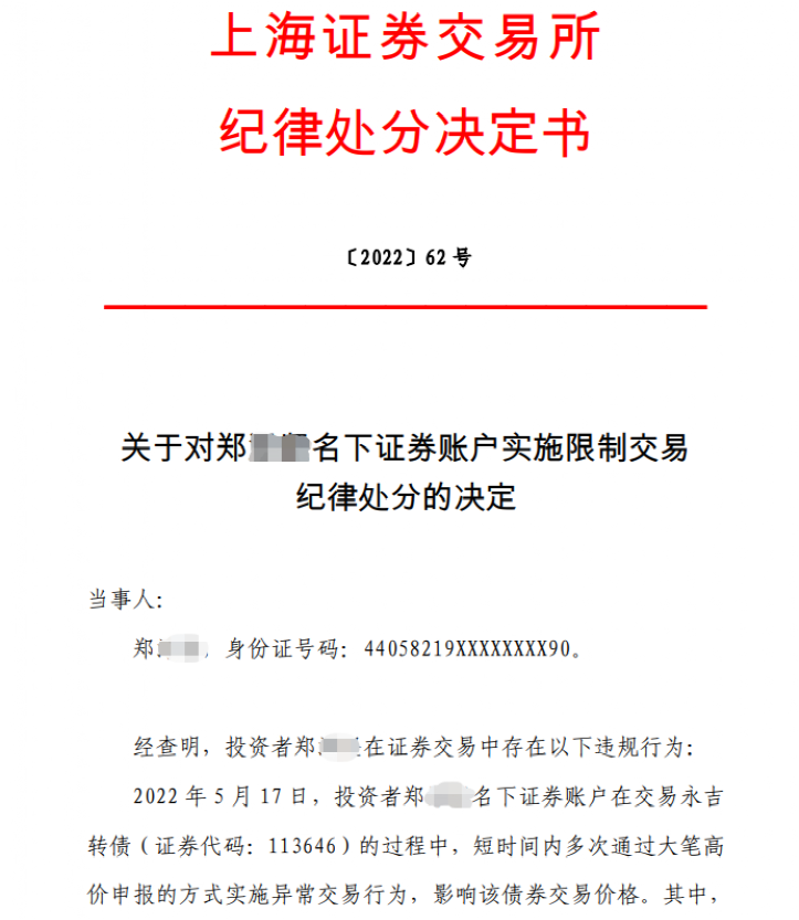 基于郑某某的违规事实和情节,上交所最终对其做出纪律处分决定:自2022年5月23日至2022年8月22日对郑泽坚名下的相关证券账户实施限制交易的纪律处分,即不得买入和卖出在本所挂牌交易的所有债券。对于该纪律处分决定,上交将通报证监会,并记入证券期货市场诚信档案。