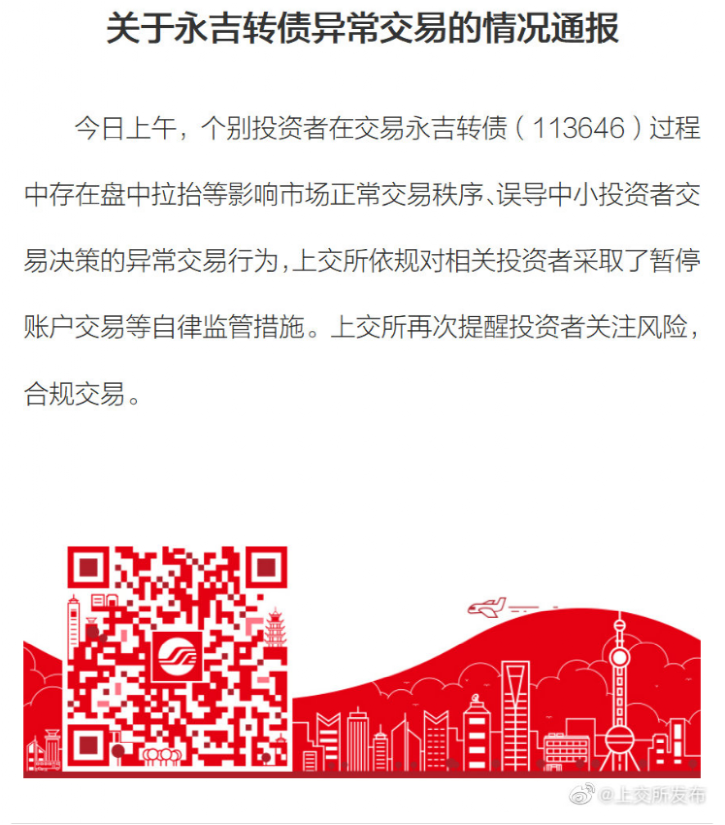 5月18日午间,上交所即发布关于永吉转债异常交易的情况通报:今日上午,个别投资者在交易永吉转债过程中存在盘中拉抬等影响市场正常交易秩序、误导中小投资者交易决策的异常交易行为,上交所依规对相关投资者采取了暂停账户交易等自律监管措施。上交所再次提醒投资者关注风险,合规交易。