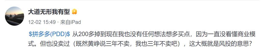 值得注意的是,上周(12月2日),段永平刚发文称,拼多多股价从200美元跌到现在的60美元,他没有卖,但也没想多买点,因为看不懂商业模式。他说自己的这种心态像是风险投资。