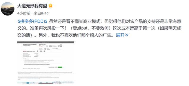 段永平此次投资,他表示,自己也不喜欢拼多多那个烦人的广告,也不要理解拼多多的广告形式和广告密度。但觉得拼多多对农产品的支持还是非常有意义的,所以决定“风投”。