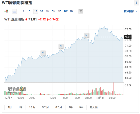 在奥密克戎恐慌情绪消散后,国际原油价格也迎来了报复性反弹。美油WTI日内最高涨3.54美元或涨5.1%,日高一度冲破73美元,尾盘涨幅收窄至不足4%,站稳72美元上方,收复11月26日奥密克戎消息以来的近半跌幅;国际布伦特原油期货日内最高涨超4%,日高冲破76美元,尾盘涨幅收窄至3.4%,站稳75美元上方,也接近收复11月26日以来的一半跌幅。