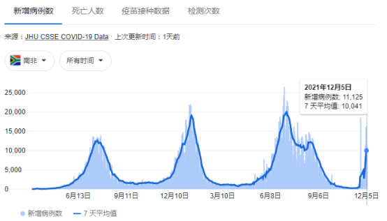 作为“奥密克戎”疫情爆发的全球中心,南非的确诊病例数正在激增。11月29日-12月5日期间,南非每日新增病例的7天移动平均值从三周前的不到300例飙升至10041例,增长超30倍;住院人数也有所上升,虽然仍相对较低,上周日的住院人数为3268人。