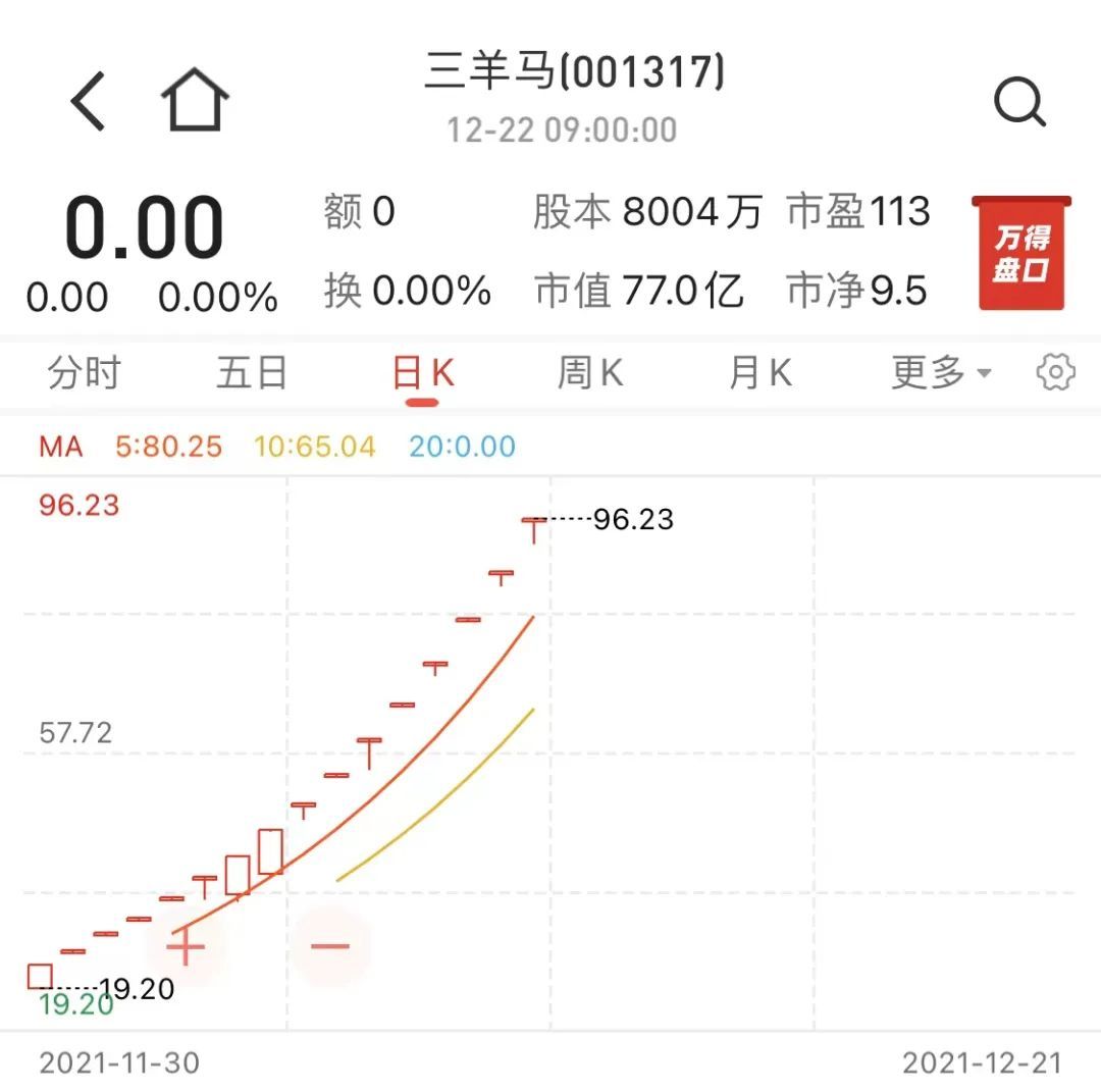 12月22日,连板股总龙头三羊马收到深交所关注函,要求确认是否存在应披露而未披露的重大信息,公司基本面是否发生重大变化,并被关进“小黑屋”。据悉,次新股三羊马自11月30日上市后,打开一字涨停板后还有超10个涨停,上市16天已是16连板。最新三羊马报96.23元/股,总市值达77亿元。