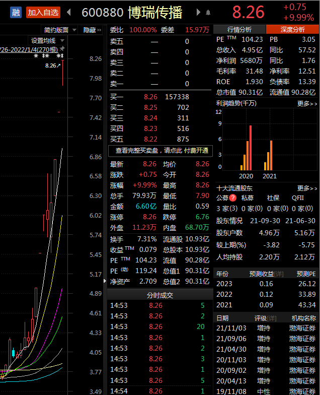 对于短期暴涨,博瑞传播表示,公司股票2022年1月4日收盘价格涨停,12月以来股价累计涨幅120.86%,滚动市盈率104.23倍。公司短期股价涨幅较大,估值较高,可能存在概念炒作风险,请广大投资者注意二级市场交易风险,理性决策,审慎投资。