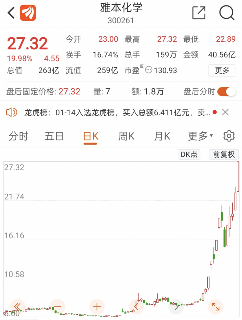 另外,暴涨360%的牛股——雅本化学(300261)于16日晚间公告,因股价异常波动,公司将就异常波动情况进行核查,公司股票自1月17日起停牌,自披露核查公告后复牌。
