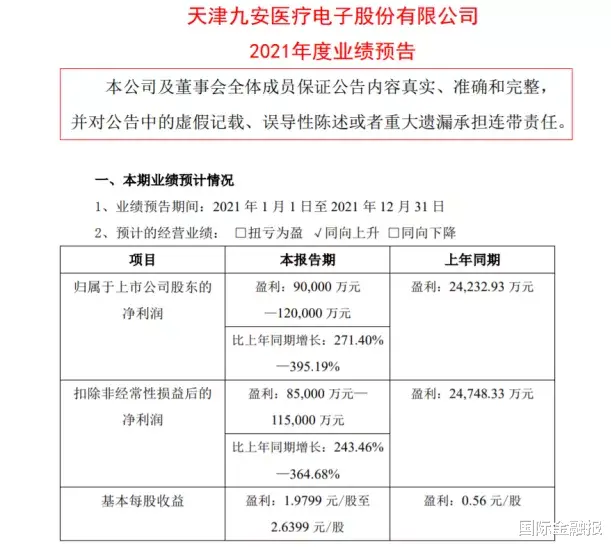 1月19日,九安医疗发布2021年度业绩预告,预计2021年全年实现净利润9亿-12亿元,同比增长271.40%-395.19%;扣非净利润8.5亿-11.5亿元,大增243.46%-365.68%。并表示,此次业绩的大增是由于2021年度继续受全球新冠疫情影响,公司的新型冠状病毒(SARS-CoV-2)抗原家用自测OTC试剂盒产品在美国市场销售业绩大幅度增长。