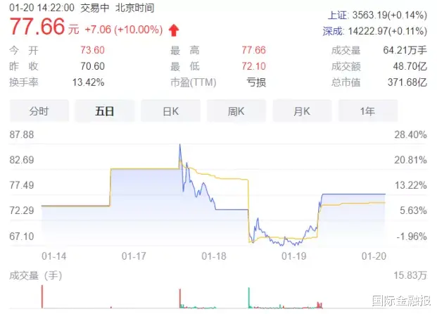 1月20日,九安医疗再度开盘涨停,报收77.66元/股,涨幅为10.00%。