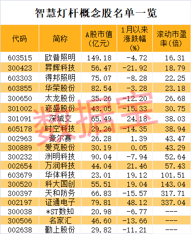 证券时报·数据宝统计,目前涉足智慧灯杆业务的上市公司有19家,这些公司A股市值普遍低于百亿。2月18日,智慧灯杆概念股出现了大范围上涨,深城交收出20%的涨停板,华体科技、名家汇、豪尔赛、太龙股份、爱克股份等涨超3%。华体科技早盘被封住涨停板,这是其连续收获的第二个涨停板,最新价创年内新高。