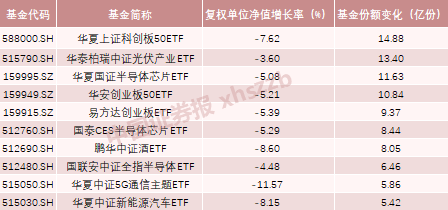 此外,易方达创业板ETF、国泰CES半导体芯片ETF、鹏华中证酒ETF等7只产品的份额增长超过5亿份。