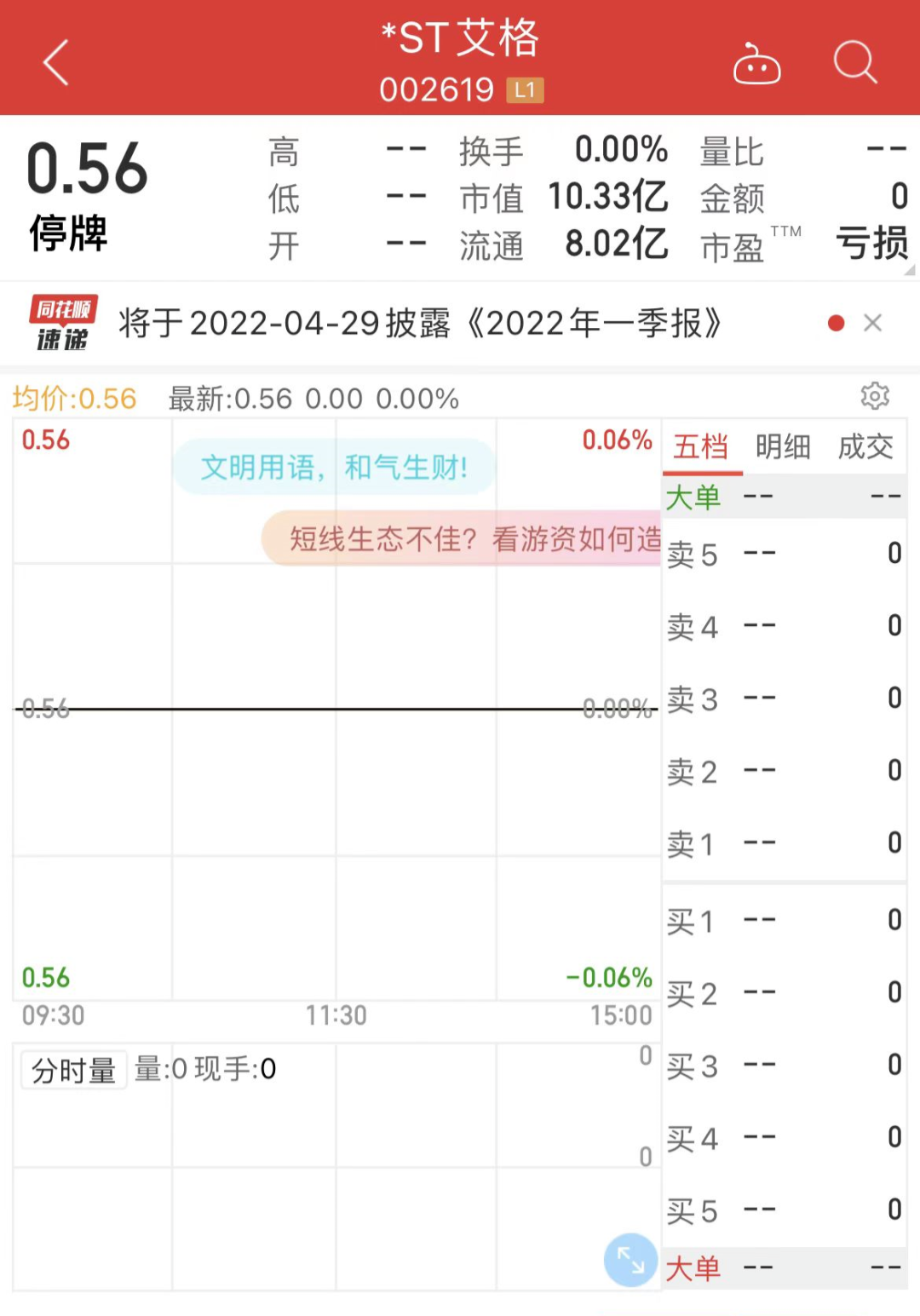 据悉,*ST艾格已于3月31日停牌,收盘报0.56元,停牌时已连续20个交易日收盘价低于一元,触及“一元退市”规定。